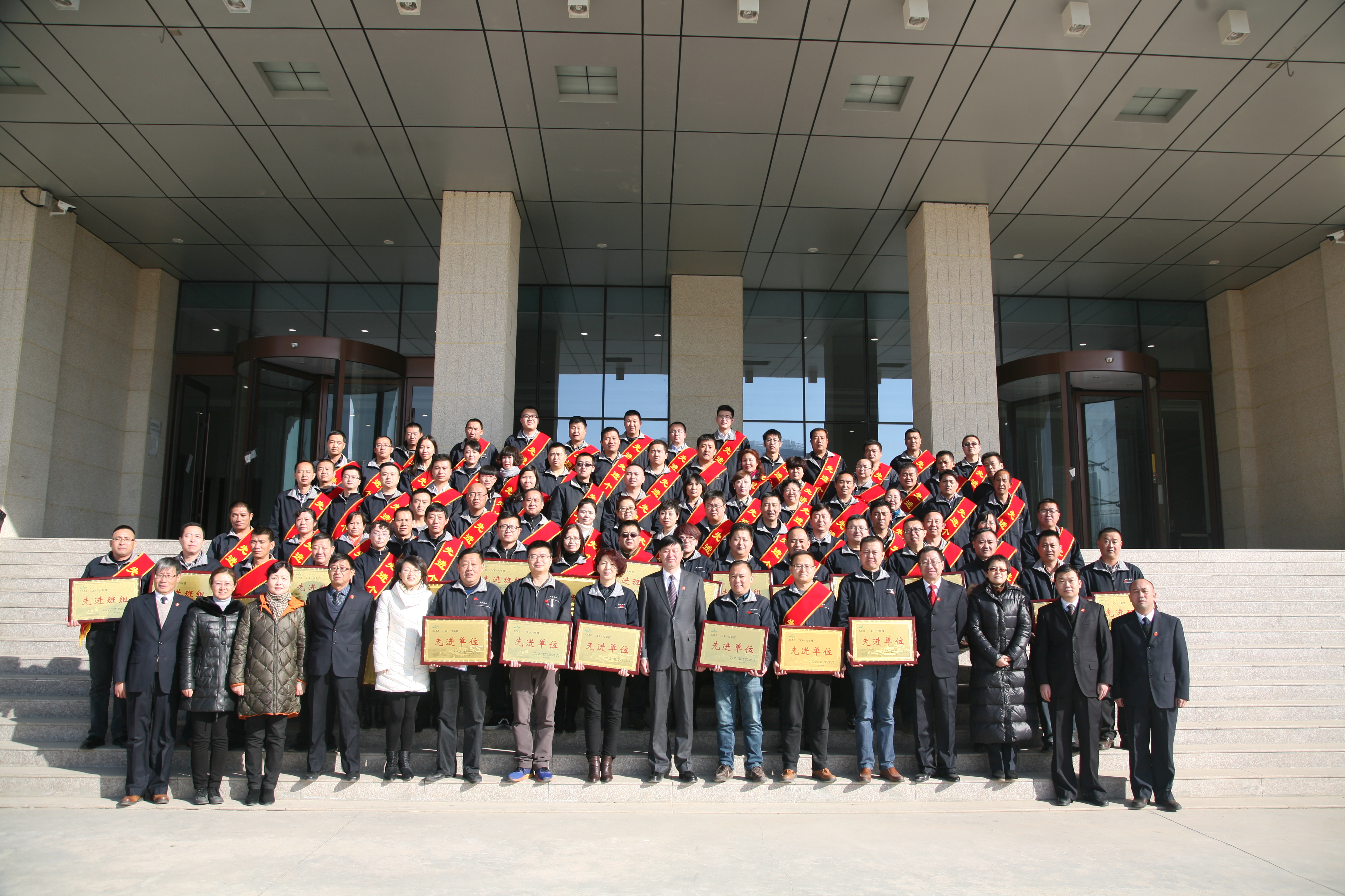 图为:公司领导班子成员与2016年度先进单位、先进班组、先进个人荣誉荣获者合影留念。