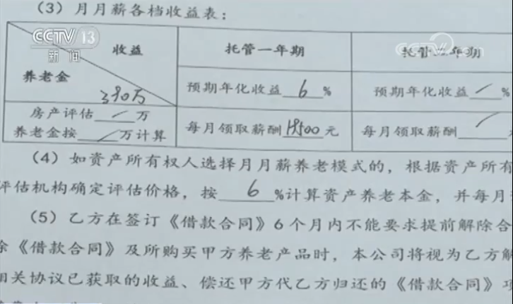 王雷:在这一流程中,老人先将自己的房屋进行抵押,并与出钱的出资方签订借款合同,再将借到的钱“投资”到所谓以房养老的“理财项目”中,以“收益”作为养老金;而推出“理财项目”的理财方,则向借钱给老人的出资方支付利息。