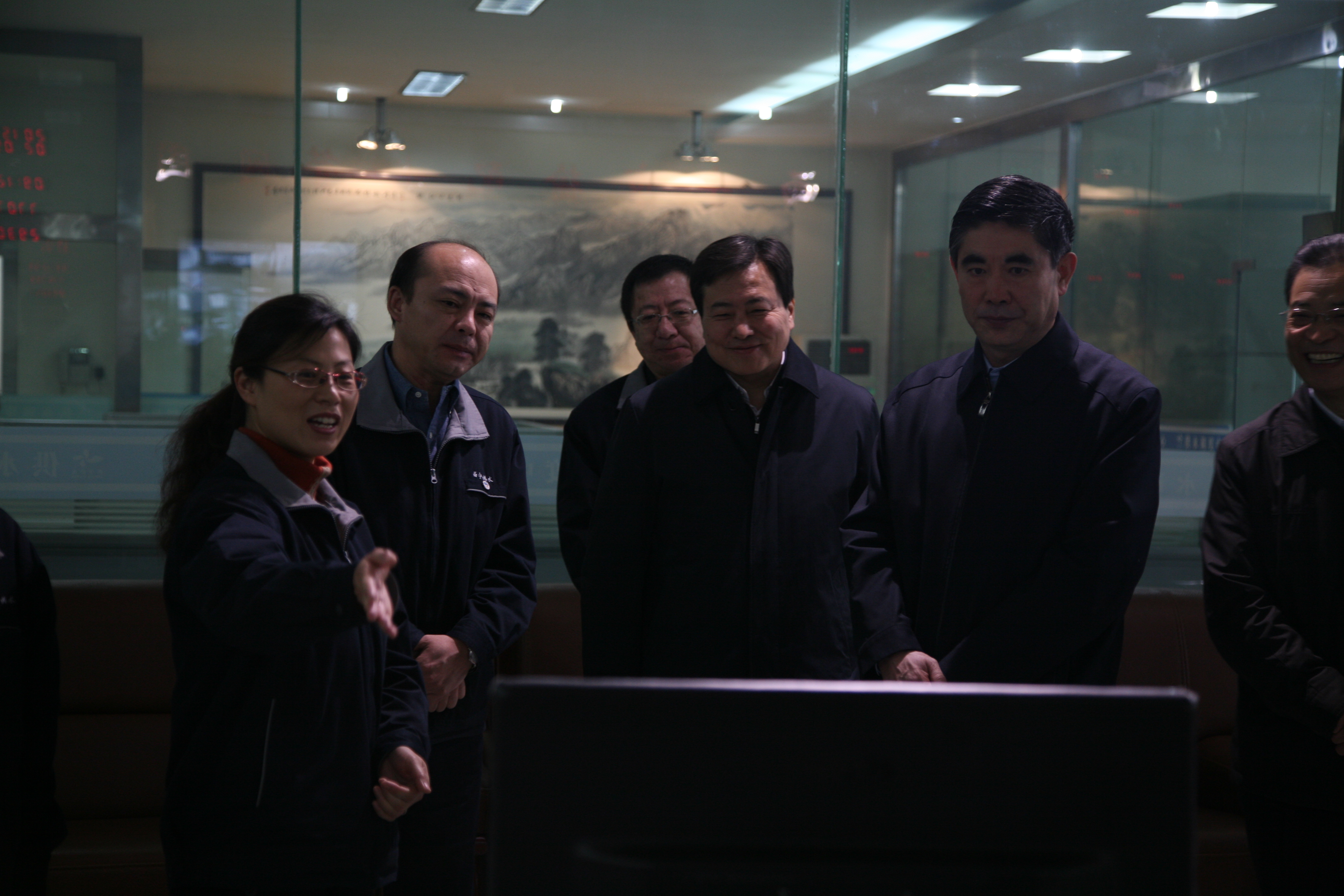 图为:省委副书记、市委书记王建军、副市长许国成正在察看西宁市管网压力情况。