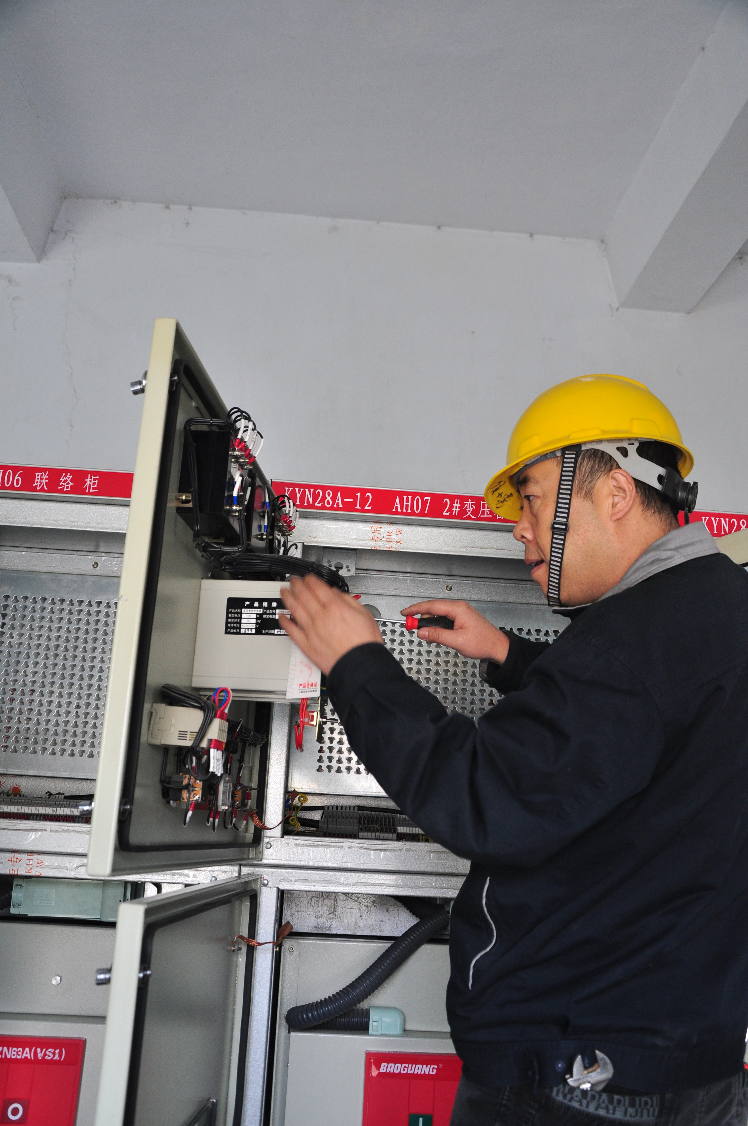 图为:大通水厂电工正在对四水源配电室35KV配电柜进行维护保养。