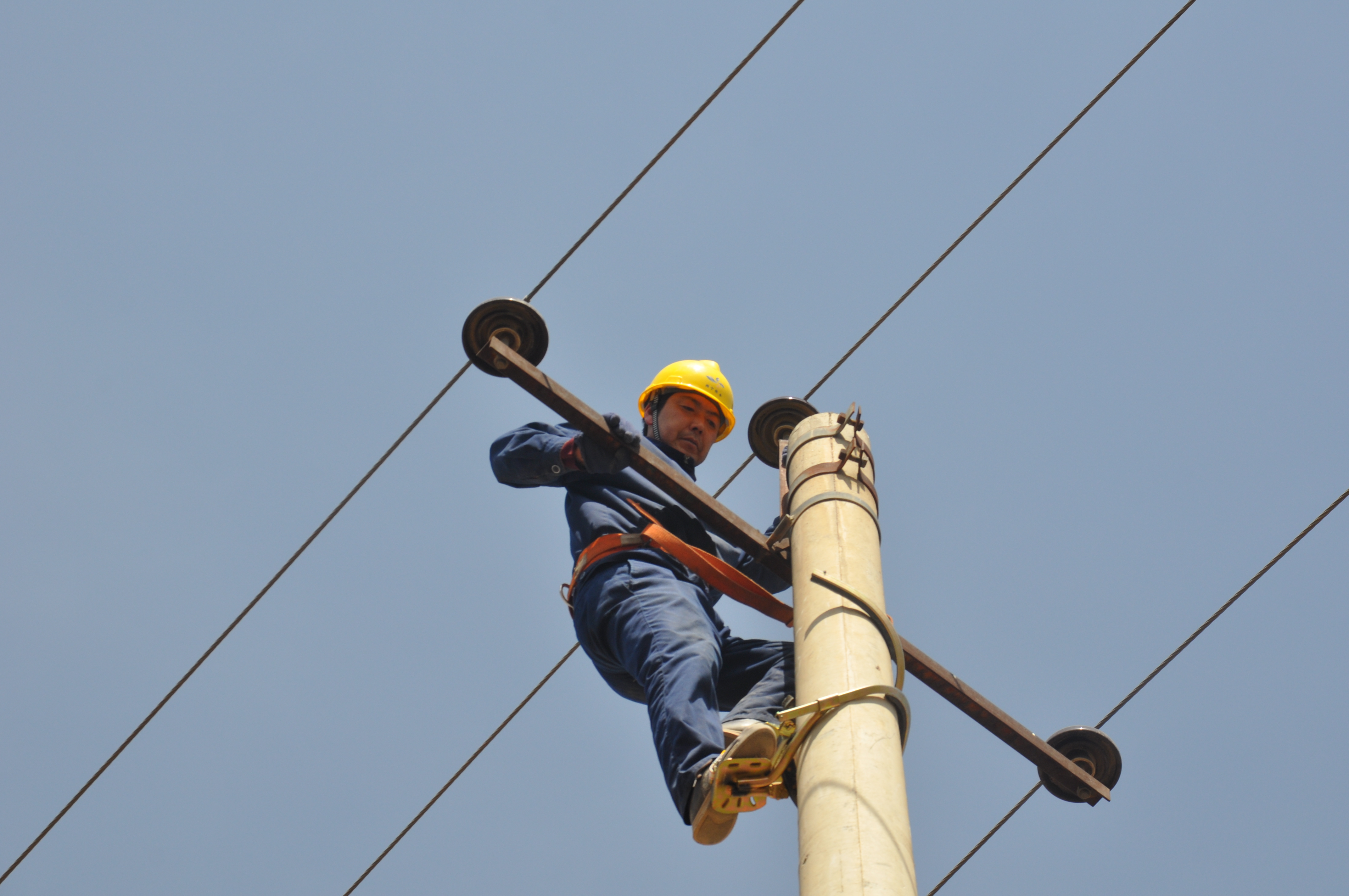图为:两名电工在清扫高压瓷瓶前检查脚扣带是否系好。
