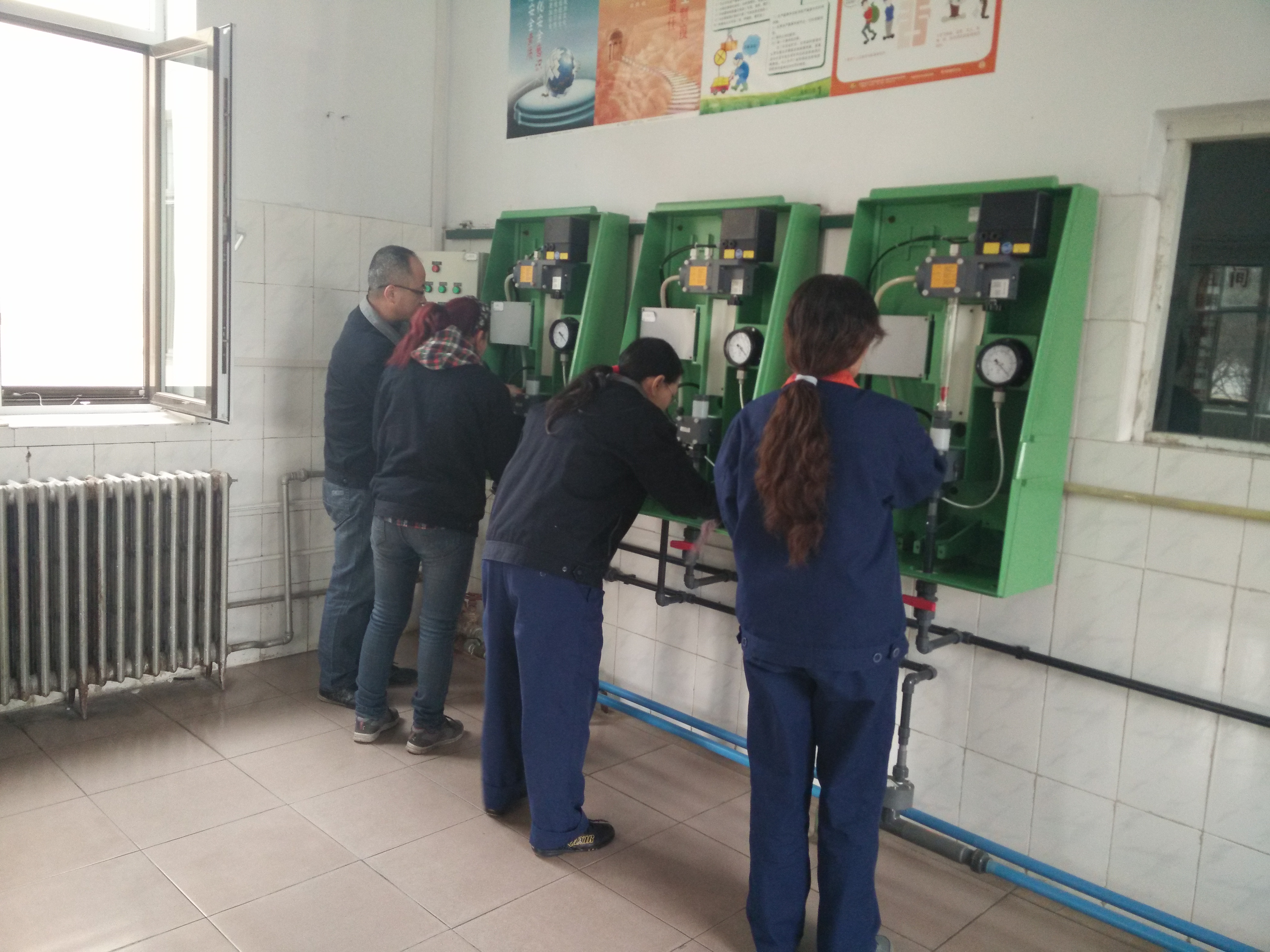 图为:大通水厂运转、净化工正在对四、六水源加氯机进行维护保养。