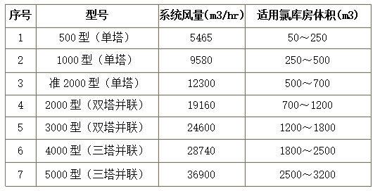 表格中的各参数为氯库房结构较为简单的选型建议,若氯库房结构较为复杂(如在线氯瓶区与空、满瓶堆放间分隔放置或氯库房为双层结构等)的情况下则根据氯库房的实际情况进行优化配置。